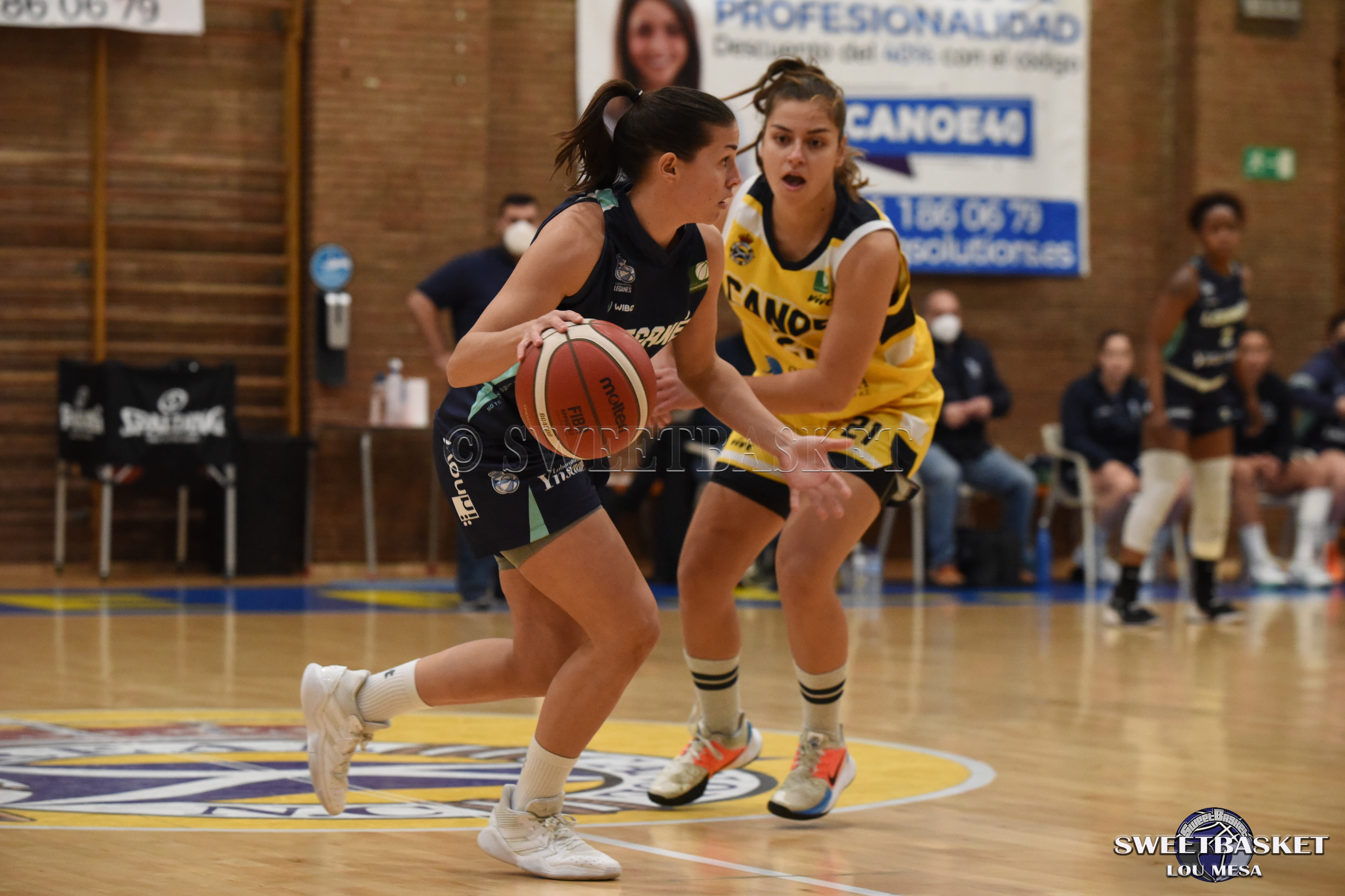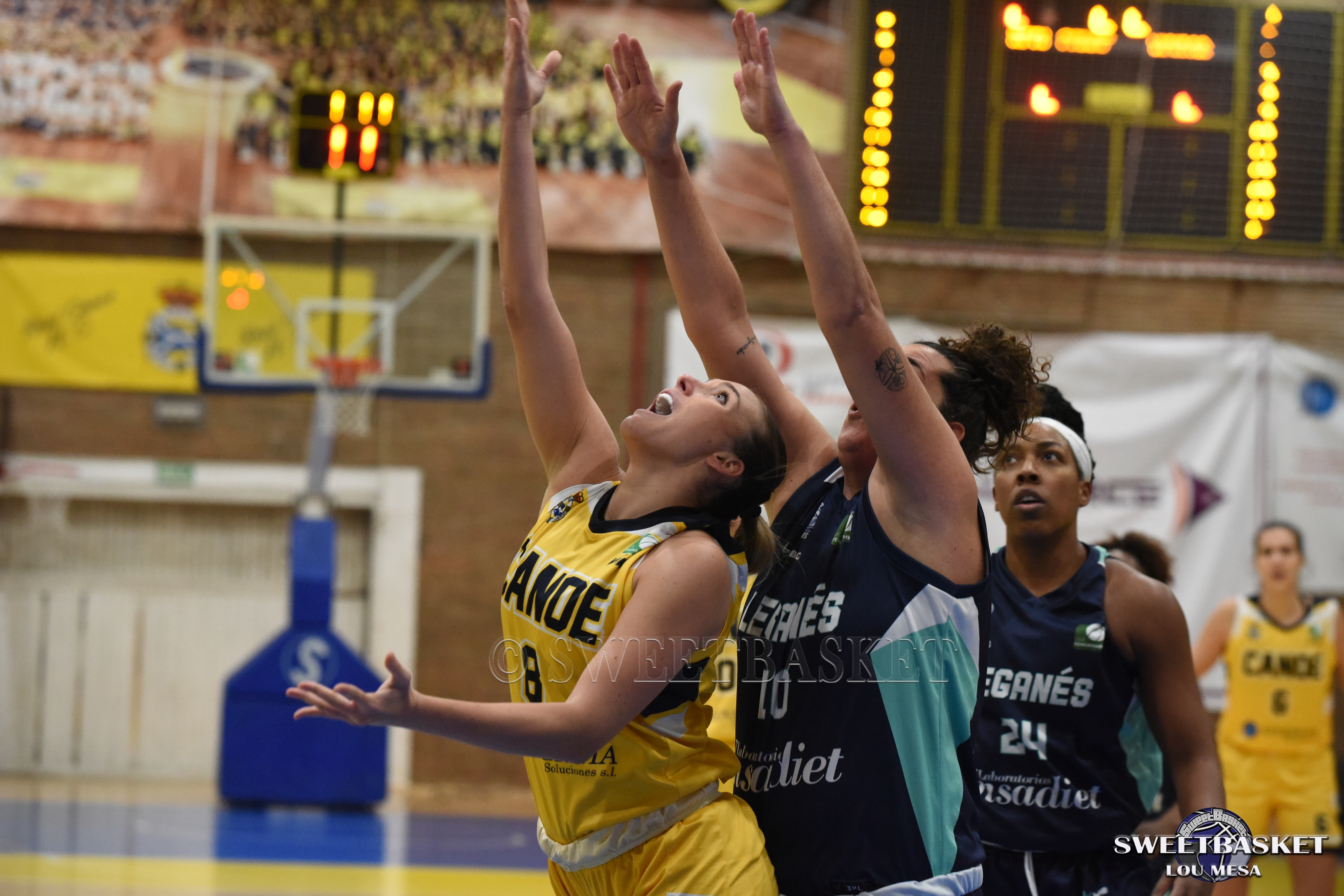 El primer cuarto tuvo claro color visitante con un parcial de 9-18 para las Leganés que ponía el balón en la pintura cuando quería y dominaba el rebote. En el segundo cuarto en cambio, las amarillas reaccionaron y con su defensa cambiante, pusieron un parcial de 16-9 en el electrónico que dejaba el partido con un parco 25-27 en el marcador.